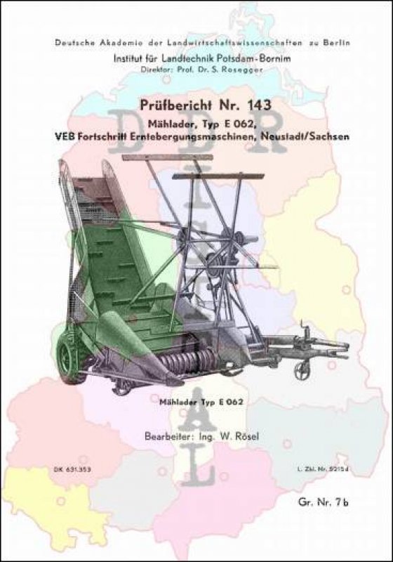 Prüfbericht Nr.: 143 Prüfstelle:: Institut für Landtechnik Potsdam-Bornim Hersteller:: VEB Fortschritt Erntebergungsmaschinen Prüfgegenstand Mählader, Typ E 062 Prüfdatum: 16. Januar 1958 Anzahl Seiten: 10