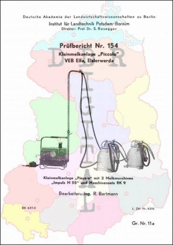 Prüfbericht Nr.: 154 Prüfstelle:: Institut für Landtechnik Potsdam-Bornim Hersteller:: VEB Elfa Elsterwerda Prüfgegenstand Kleinmelkanlage "Piccolo" Prüfdatum: 28. Januar 1957 Anzahl Seiten: 6
