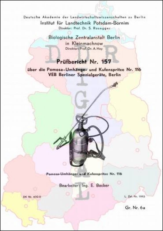 Prüfbericht Nr.: 157 Prüfstelle:: Institut für Landtechnik Potsdam-Bornim Hersteller:: VEB Berliner Spezial-Geräte Prüfgegenstand Pomosa-Umhänge- und Kufenspritze Nr. 116 Prüfdatum: 2. Oktober 1958 Anzahl Seiten: 8