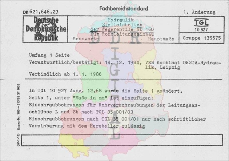 Standard: 1. Änderung Ausgabe: Dezember 1984 verbindlich ab: 01.01.1986 Verantwortlich: VEB Kombinat ORSTA-Hydraulik Leipzig bestätigt am: 14.12.1984 Bestätigt von: VEB Kombinat ORSTA-Hydraulik Leipzig Anzahl Seiten: 2