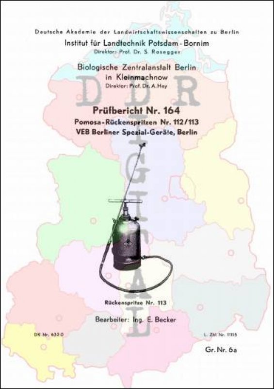 Prüfbericht Nr.: 164 Prüfstelle:: Institut für Landtechnik Potsdam-Bornim Hersteller:: VEB Berliner Spezial-Geräte Prüfgegenstand Pomosa-Rückenspritzen Nr. 112/113 Prüfdatum: 18. September 1958 Anzahl Seiten: 8