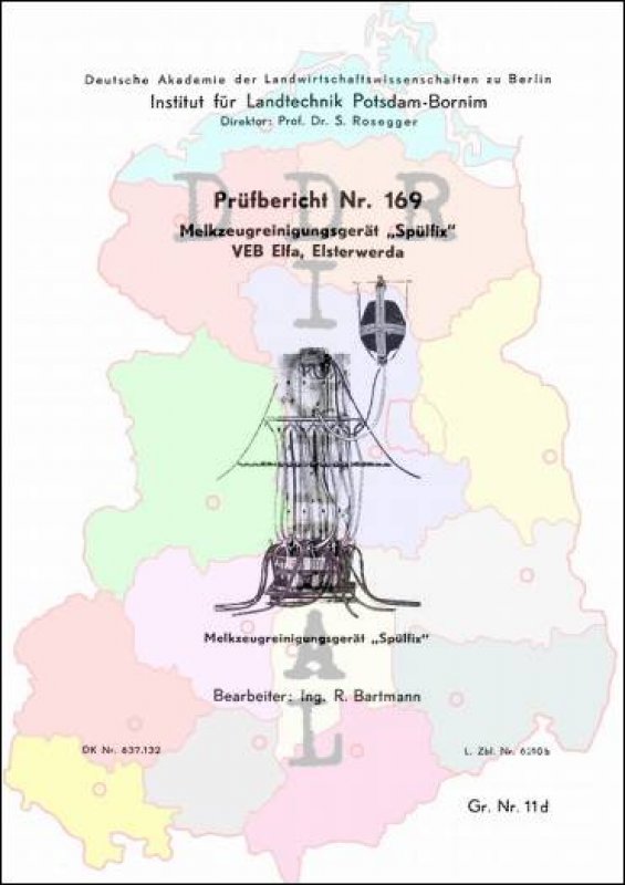 Prüfbericht Nr.: 169 Prüfstelle:: Institut für Landtechnik Potsdam-Bornim Hersteller:: VEB Elfa Elsterwerda Prüfgegenstand Melkzeugreinigungsgerät "Spülfix" Prüfdatum: 5. Februar 1958 Anzahl Seiten: 8