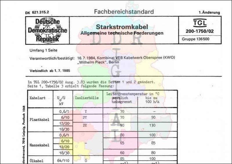 Standard: 1. Änderung Ausgabe: Juli 1984 verbindlich ab: 01.07.1985 Verantwortlich Kombinat VEB Kabelwerk Oberspree Wilhelm Pieck Berlin bestätigt am: 16.07.1984 Bestätigt von: Kombinat VEB Kabelwerk Oberspree Wilhelm Pieck Berlin Anzahl Seiten: 2