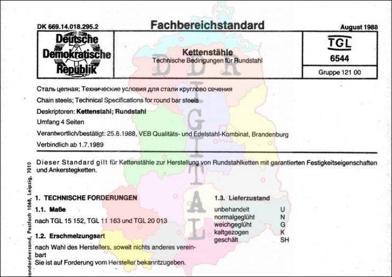 Standard: Fachbereichstandard Ausgabe: August 1988 verbindlich ab: 01.07.1989 Verantwortlich: VEB Qualitäts- und Edelstahl-Kombinat Henningsdorf bestätigt am: 25.08.1988 Bestätigt von: VEB Qualitäts- und Edelstahl-Kombinat Henningsdorf Anzahl Seiten: 4