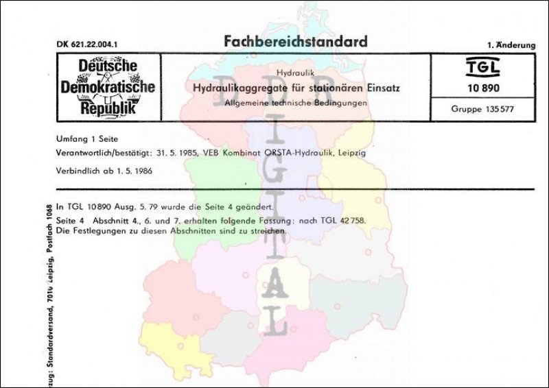 Standard: 1. Änderung Ausgabe: Mai 1985 verbindlich ab: 01.05.1986 Verantwortlich VEB Kombinat ORSTA-Hydraulik Leipzig bestätigt am: 31.05.1985 Bestätigt von: VEB Kombinat ORSTA-Hydraulik Leipzig Anzahl Seiten: 2