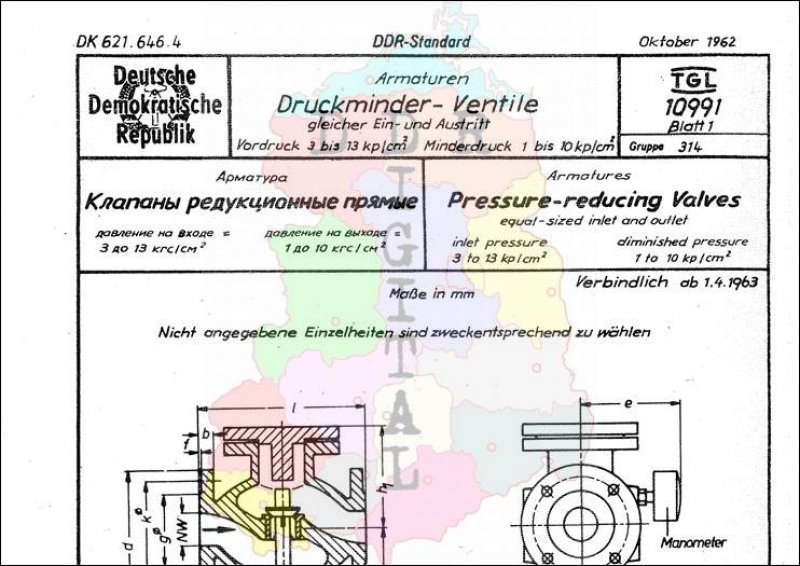 Standard: DDR-Standard Ausgabe: Oktober 1962 verbindlich ab: 01.04.1963 Zuständiger Fachbereich 44, Armaturen bestätigt am: 22.10.1962 Bestätigt von: Amt für Standardisierung Berlin Anzahl Seiten: 2