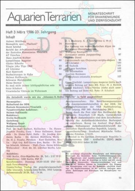 Ausgabe: Autor: Redaktionsbeirat Herausgeber: Kulturbund der DDR, Zentrale Kommission Vivaristik Erscheinungsjahr: 1986 Anzahl Seiten: 36