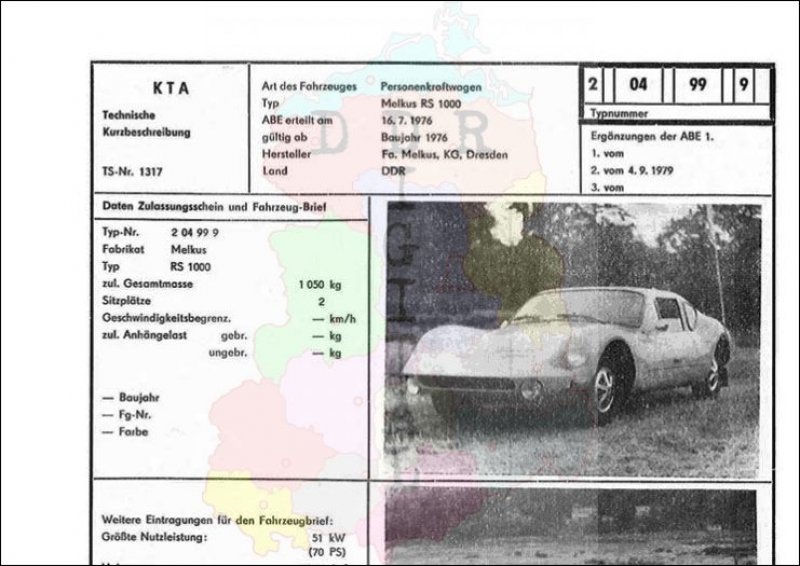 Art des Fahrzeuges: Personenkraftwagen Typ: Melkus RS 1000 ABE erteilt am: 16.07.1976 gültig ab: 1976 Hersteller: Melkus KG Land: DDR Ergänzung zur ABE: 2. vom 04.09.1979 Typnummer: 204999 Anzahl Seiten: 2
