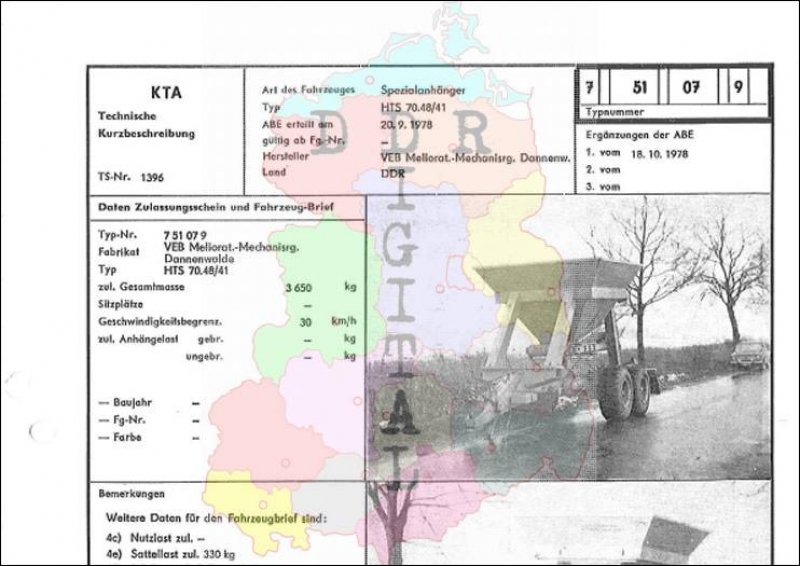 Art des Fahrzeuges: Spezialanhänger Typ: HTS 70.48/41 ABE erteilt am: 20.09.1978 gültig ab: 1978 Hersteller: VEB Mellorat.-Mechanisrg. Dannenw. Land: DDR Ergänzung zur ABE: 1. vom 18.10.1978 Typnummer 751079 Anzahl Seiten: 2