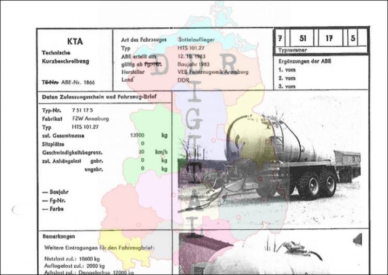 Art des Fahrzeuges: Sattelauflieger Typ: HTS 101.27 ABE erteilt am: 12.10.1983 gültig ab: 1983 Hersteller: VEB Fahrzeugwerk Annaberg Land: DDR Ergänzung zur ABE: Typnummer 751175 Anzahl Seiten: 2