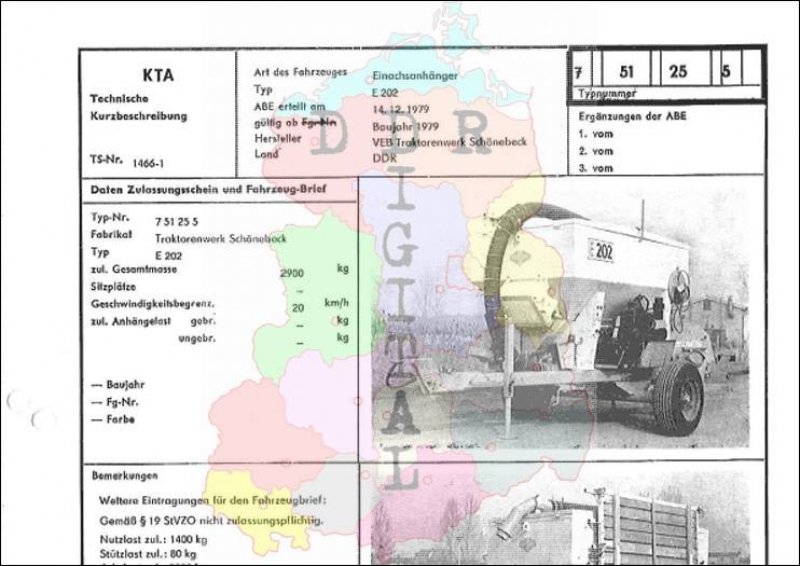 Art des Fahrzeuges: Einachsanhänger Typ: E 202 ABE erteilt am: 14.12.1979 gültig ab: 1979 Hersteller: VEB Traktorenwerk Schönebeck Land: DDR Ergänzung zur ABE: Typnummer 751255 Anzahl Seiten: 2