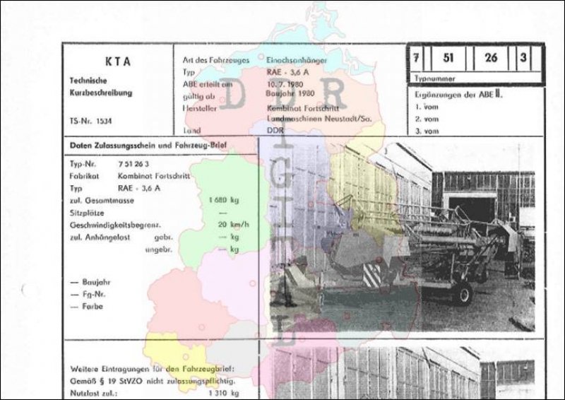 Art des Fahrzeuges: Einachsanhänger Typ: RAE - 3,6 A ABE erteilt am: 10.07.1980 gültig ab: 1980 Hersteller: Kombinat Fortschritt Landmaschinen Neustadt/Sa. Land: DDR Ergänzung zur ABE: Typnummer 751263 Anzahl Seiten: 2