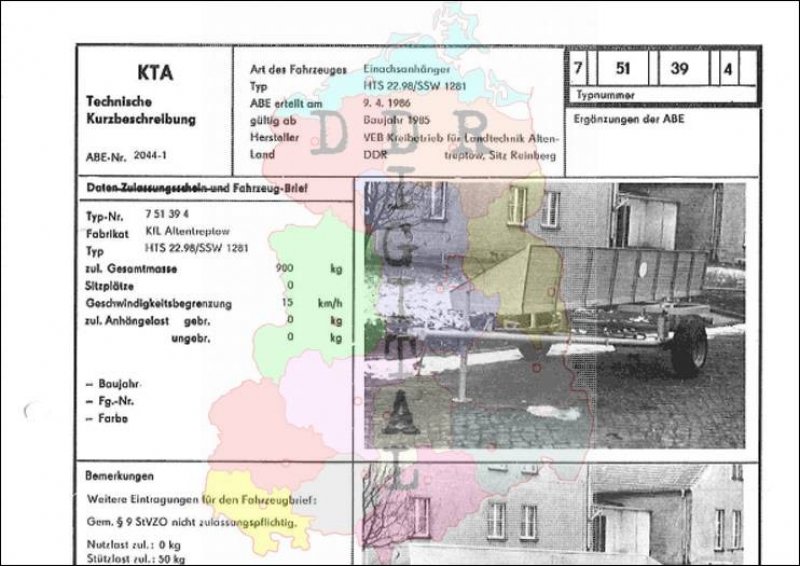 Art des Fahrzeuges: Einachsanhänger Typ: HTS 22.98/SSW 1281 ABE erteilt am: 09.04.1986 gültig ab: 1985 Hersteller: VEB Kreisbaubetrieb für Landtechnik Altentreptow, Sitz Reinberg Land: DDR Ergänzung zur ABE: Typnummer 751394 Anzahl Seiten: 2