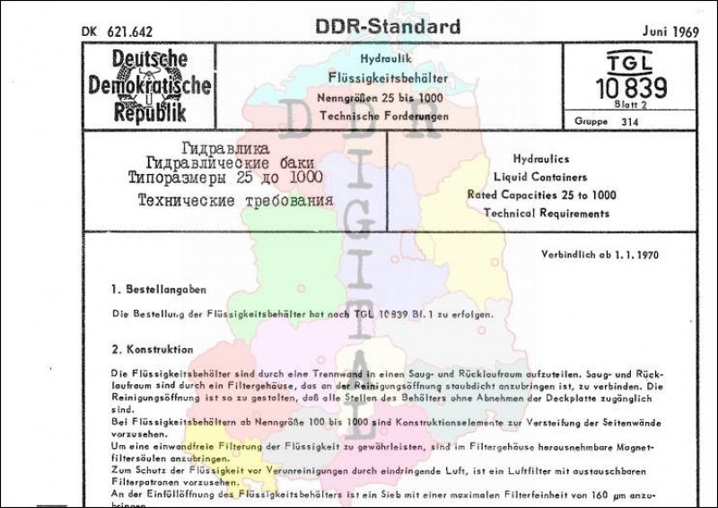 Standard: DDR-Standard Ausgabe: Juni 1969 verbindlich ab: 01.01.1970 Zuständiger Fachbereich: 25, Hydraulik bestätigt am: 06.06.1969 Bestätigt von: Amt für Standardisierung Berlin Anzahl Seiten: 2