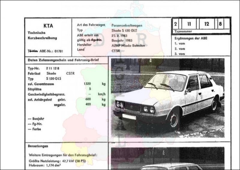 Art des Fahrzeuges: Personenkraftwagen Typ: Skoda S 120 GLS ABE erteilt am: 20.02.1983 gültig ab: 1983 Hersteller: AZNP Mlada Boleslav Land: CSSR Ergänzung zur ABE: Typnummer: 211128 Anzahl Seiten: 2