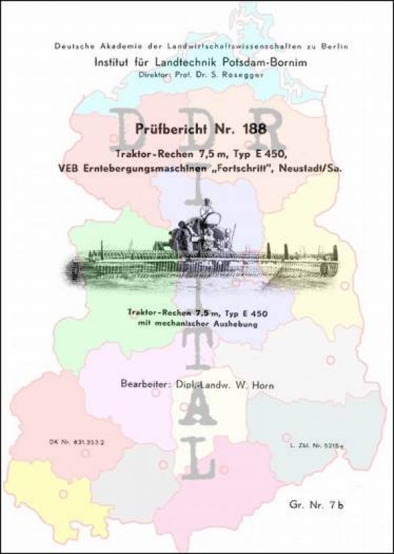 Prüfbericht Nr.: 188 Prüfstelle:: Zentrale Prüfstelle für Landtechnik Potsdam-Bornim Hersteller:: VEB Erntebergungsmaschinen Fortschritt Prüfgegenstand Traktor-Rechen 7,5 m Typ E 450 Prüfdatum: 17. Februar 1959 Anzahl Seiten: 8