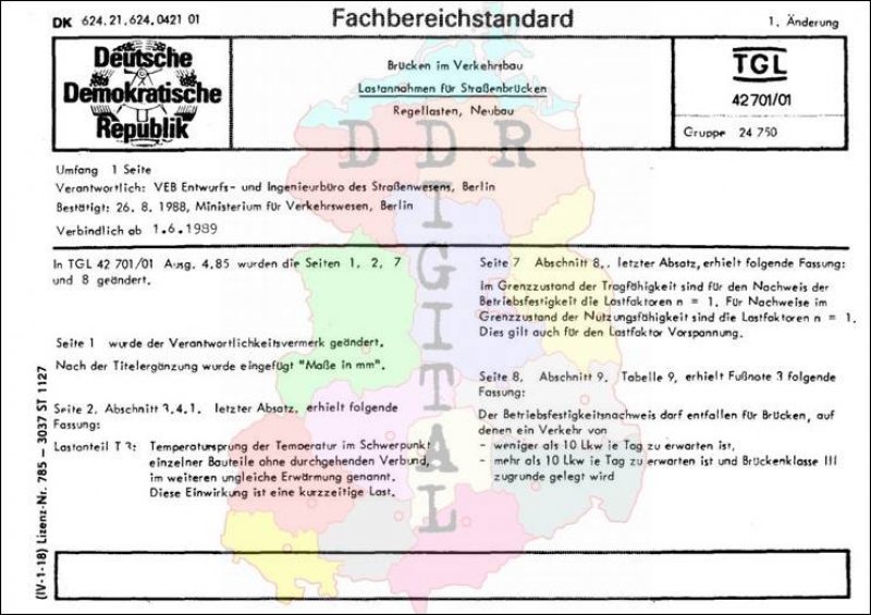Standard: 1. Änderung Ausgabe: August 1988 verbindlich ab: 01.06.1989 Verantwortlich: VEB Entwurfs- und Ingenieurbüro des Straßenwesens bestätigt am: 26.08.1988 Bestätigt von: Ministerium für Verkehrswesen Anzahl Seiten: 2