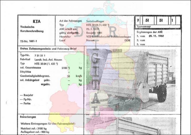 Art des Fahrzeuges: Sattelauflieger Typ: HTS 32.04/L 432 ABE erteilt am: 25.07.1979 gültig ab: 1981 Hersteller: VEB Landtechnische Industrieanlagen Nauen Land: DDR Ergänzung zur ABE: 1. vom 29.11.1982 Typnummer 751511 Anzahl Seiten: 2