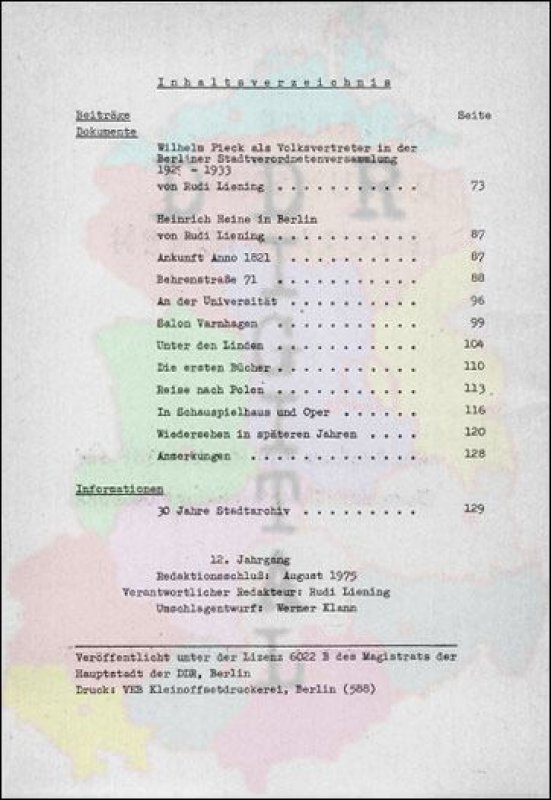 Auflage: 12. Jahrgang Autor: Rudi Liening Direktor des Stadtarchivs Herausgeber: Stadtarchiv Berlin Erscheinungsjahr: August 1975 Anzahl Seiten: 68