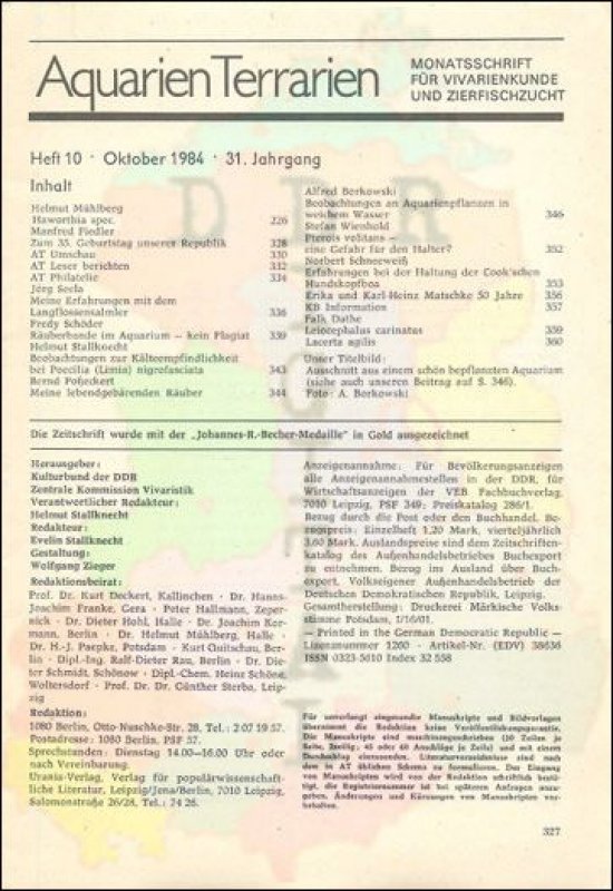 Ausgabe: Autor: Redaktionsbeirat Herausgeber: Kulturbund der DDR, Zentrale Kommission Vivaristik Erscheinungsjahr: 1984 Anzahl Seiten: 36