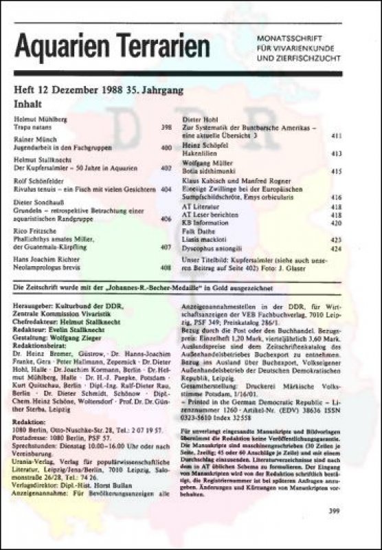 Ausgabe: Autor: Redaktionsbeirat Herausgeber: Kulturbund der DDR, Zentrale Kommission Vivaristik Erscheinungsjahr: 1988 Anzahl Seiten: 36