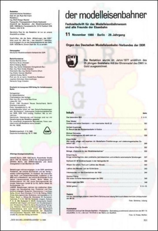 Ausgabe: 29. Jahrgang Autor: Redaktionsbeirat Herausgeber: Deutscher Modelleisenbahn-Verband der DDR Erscheinungsjahr: 1980 Anzahl Seiten: 32
