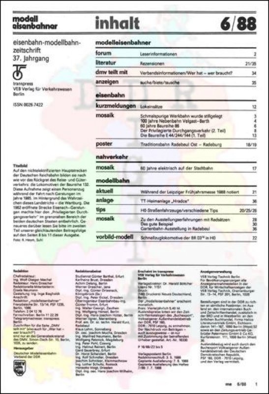 Ausgabe: Autor: Redaktionsbeirat Herausgeber: Deutscher Modelleisenbahn-Verband der DDR Erscheinungsjahr: 1988 Anzahl Seiten: 32