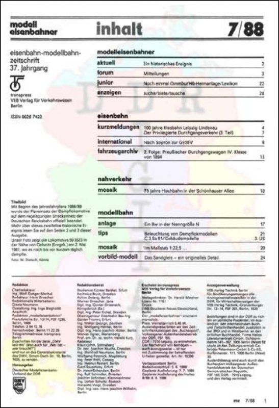 Ausgabe: Autor: Redaktionsbeirat Herausgeber: Deutscher Modelleisenbahn-Verband der DDR Erscheinungsjahr: 1988 Anzahl Seiten: 32