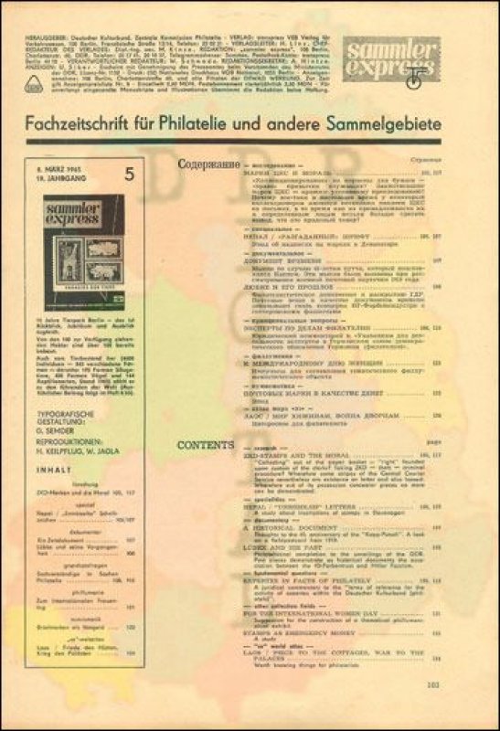 Auflage: Autor: Redaktion "sammler express" Herausgeber: Philatelistenverband im Kulturbund der DDR Erscheinungsjahr: 1965 Anzahl Seiten: 24
