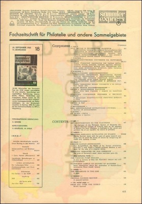 Auflage: Autor: Redaktion "sammler express" Herausgeber: Philatelistenverband im Kulturbund der DDR Erscheinungsjahr: 1965 Anzahl Seiten: 24