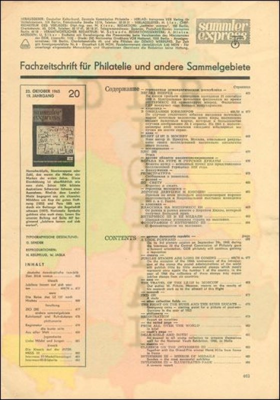 Auflage: Autor: Redaktion "sammler express" Herausgeber: Philatelistenverband im Kulturbund der DDR Erscheinungsjahr: 1965 Anzahl Seiten: 24