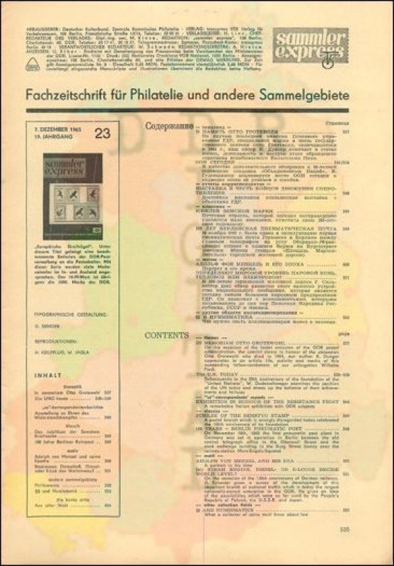 Auflage: Autor: Redaktion "sammler express" Herausgeber: Philatelistenverband im Kulturbund der DDR Erscheinungsjahr: 1965 Anzahl Seiten: 24