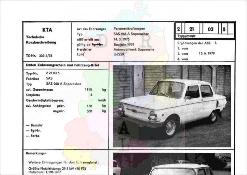 Art des Fahrzeuges: Personenkraftwagen Typ: SAS 968 A Saporoshez ABE erteilt am: 14.03.1975 gültig ab: 1979 Hersteller: Automobilwerk Saporoshez Land: UdSSR Ergänzung zur ABE: 2. vom 15.06.1979 Typnummer: 221034 Anzahl Seiten: 2