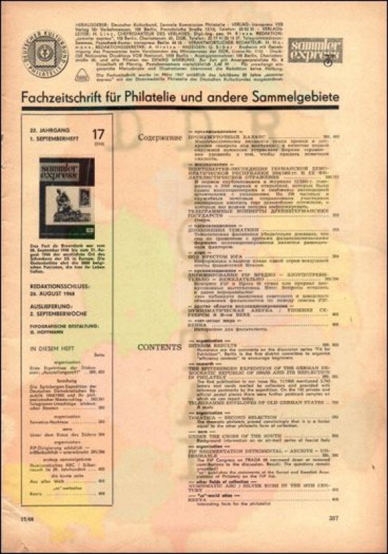 Auflage: Autor: Redaktion "sammler express" Herausgeber: Philatelistenverband im Kulturbund der DDR Erscheinungsjahr: 1968 Anzahl Seiten: 24