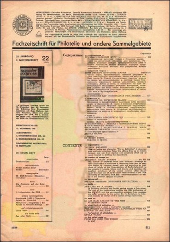 Auflage: Autor: Redaktion "sammler express" Herausgeber: Philatelistenverband im Kulturbund der DDR Erscheinungsjahr: 1968 Anzahl Seiten: 24