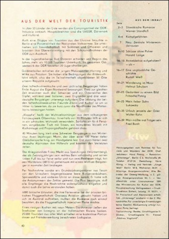 Ausgabe: 5. Jahrgang Autor: Redaktion "Unterwegs" Herausgeber: Komitee für Touristik und Wandern der DDR Erscheinungsjahr: 1961 Anzahl Seiten: 44