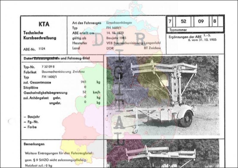 Art des Fahrzeuges: Einachsanhänger Typ: FH 1600/1 ABE erteilt am: 14.10.1970 gültig ab: 1985 Hersteller: VEB Baumechanisierung Lengenfeld, BT Zwickau Land: DDR Ergänzung zur ABE: 6. vom 31.10.1985 Typnummer 752098 Anzahl Seiten: 2